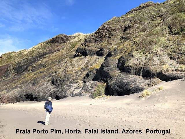 After lunch … (MMMMM … leftover Francesinhas) … we went out for an afternoon of hiking up nearby Monte da Guia. We walked a block over to the ancient “fortified gate to Porto Pim” to get access down to Praia (beach) do Porto Pim. We walked the length of the beach, then up again off the beach to the 700 year old defunct whaling station that was the genesis of what is now the city of Horta. We wandered around, always heading uphill onto Monte da Guia, where there are a series of miradouras (vewpoints) looking out over Porto Pim Bay, and Porto Pim Beach, and the city of Horta, and even over to the relatively close Azores island of Pico. We were just meandering around, enjoying the sightseeing, I was taking lots of photos, when I noticed some ugly clouds coming over the inland mountains west of the city. I told Joanne we should turn around and start heading back down the mountain, because I thought it would probably begin raining within an hour.